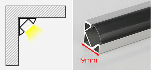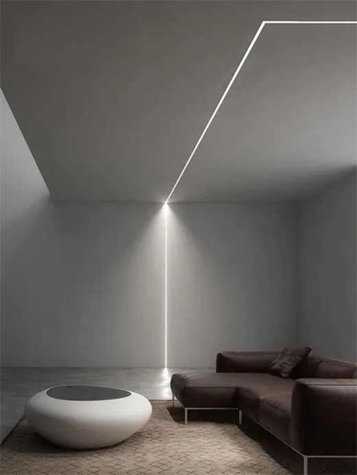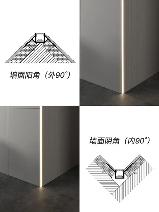 与以上三种做法相比,阳角带铝槽的灯带比较小。基本安装在墙面的转角处,可以解决阳角处不同材料之间的封闭问题,弱化墙面的边角,具有很强的装饰效果,提升空间的时尚气质。这种灯带型材有阴角款和阳角款两种,更推荐阳角款,颜值更高,功能更多。