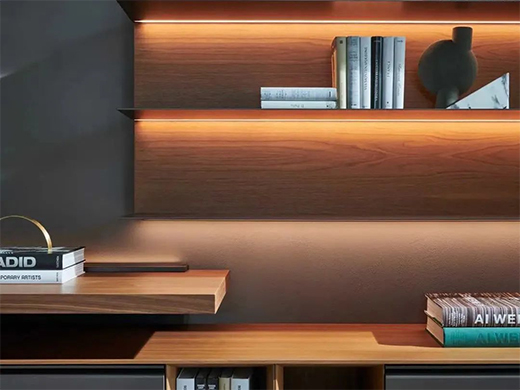 柜体灯带也是十分常见的设计,在柜子的层架内侧安置灯带,可以为暗处增加辅助照明,弱化空间的封闭感。