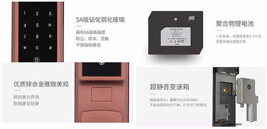 Hobere-H5采用5A级钻化钢化玻璃,可达到耐刮、耐磨、耐脏的绝佳效果;采用优质锌合金材质的面板,硬度、强度高,且雅致美观,视觉效果强;采用聚合物锂电池,节约环保,安全可靠,使用寿命长;采用超静音变速箱,超高级扭力,超充沛动力,开门顺畅;采用经过特殊防水防潮处理的电路板,经久耐用。