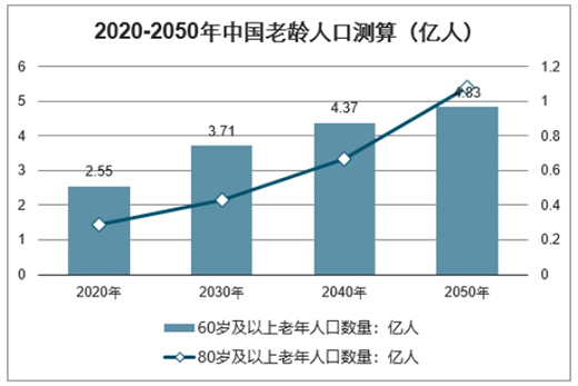 据《2019-2025年中国老年健康服务行业市场全景调查及投资方向研究报告》数据显示:2018年末中国60岁及以上人口已达24949万人,占17.9%,未来中国老龄人口仍将进一步增加。同时,该报告预测到2020年我国60岁及以上老年人口数量将达到2.55亿人,80岁及以上老年人口数量也将达到0.29亿人。