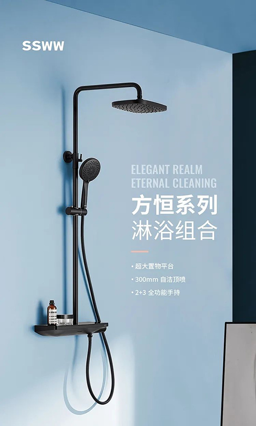 超大置物平台,一次放下沐浴所需的洗漱用品,300mm自洁顶喷,任肆意洒下的水流拍打身躯,清爽洁净 健康舒心,创新一体式控制手轮,三种出水模式与冷暖水温,一手掌控 随心所浴,有限的空间拥有无限的可能,浪鲸卫浴,为你的美好夏日生活,增添一点幸福指数。