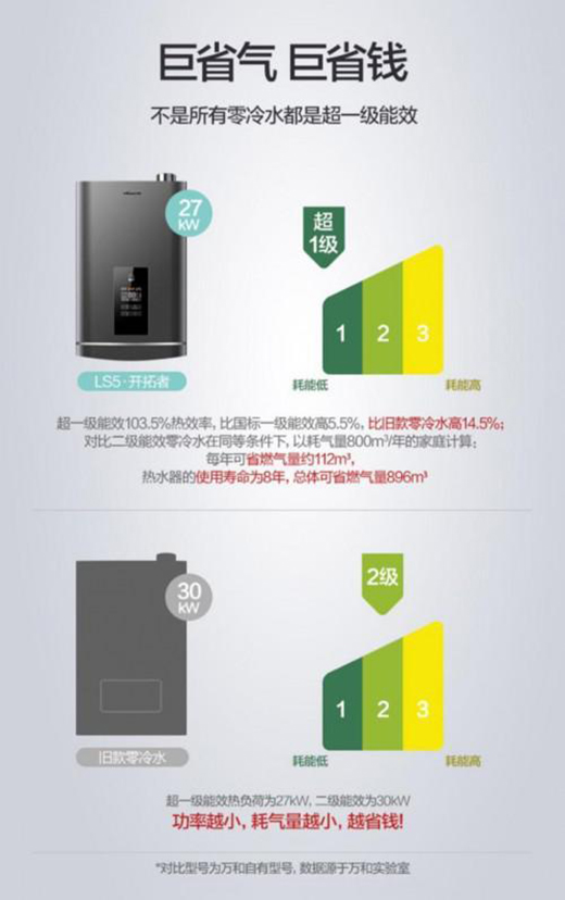 万和实验室曾用自有的老款二级能效零冷水燃气热水器做对比,同是16升机型,额定热负荷二级能效按30kW,一级能效按27kW来折算,考虑到一年春夏秋冬,平均下来,在热水器每天按65%负荷运行、6口人每天洗浴时长共1.5小时的条件下,LS5系列比旧款零冷水燃气热水器热效率高14.5%,每年可节省约112立方燃气量,按照3.4元一立方燃气费来算,则可省380元,可以说是消费者的省钱神器了。(数据来源于万和实验室)