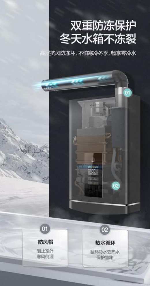万和LS5零冷水燃气热水器配有高性能防风帽,可有效阻止冷风倒灌,同时配有直流变频水泵循环加热系统,有效防止机器冻坏冻裂。而直流变频鼓暖风、火排循环燃烧技术,更有效地避免了水箱冻裂的问题,即使是零下极端的环境,依旧能够使用自如。