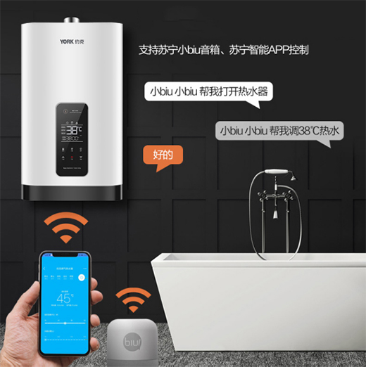 YORK约克零冷水燃气热水器YK-FT3基于Biu系统,可通过苏宁智能APP和小Biu音箱实现多种远程操控方式,提前预约热水、调节温度等。有时只需一句话的事儿,即可开启智能沐浴新生活,体验智能家居乐趣。