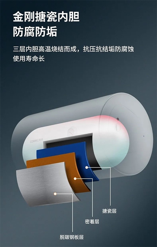 三层高温烧结内胆,抗压抗垢防腐蚀。搪瓷层防腐防锈;密着层分子级结合,同步热胀冷缩;脱碳钢板层耐高压,不裂不爆。