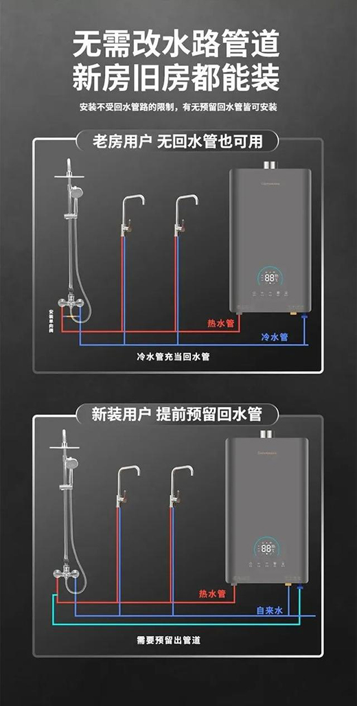 HX221A零冷水热水器突破房屋管道布局限制,新房老房均可安装,让您无需担忧安装难题。新房装修可以提前预埋回水管,使全屋做到零冷水、零等待;而老房想要换新机,也无需改造水管线路,只需在离热水器最远的浴室加装单向阀,即可实现全屋零冷水效果。