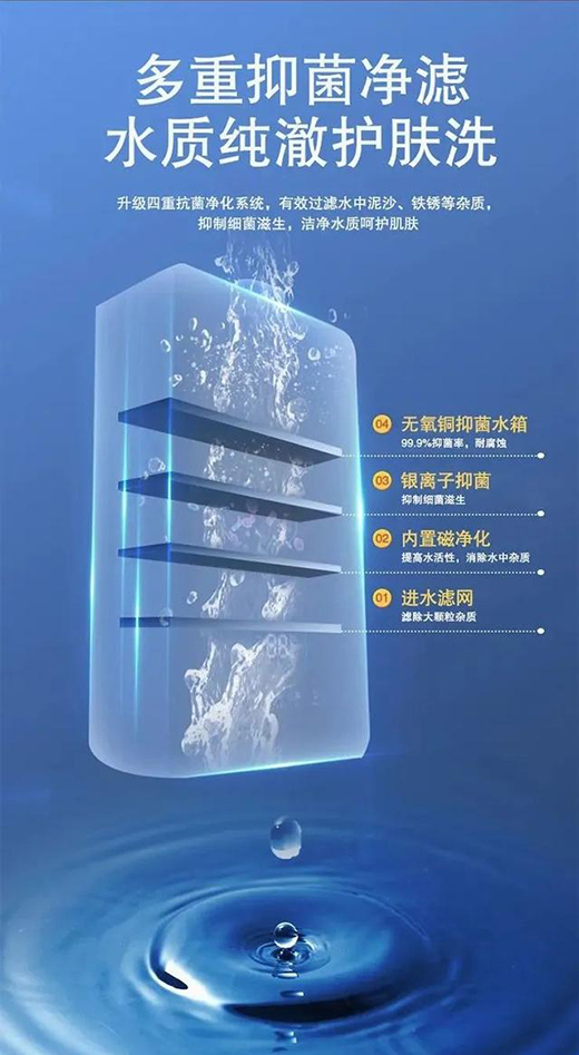 热水器HX221A搭载四重净水抑菌系统,不仅层层过滤拦截水中杂质,还对水质进行高效灭菌抑菌处理,还原洁净水质,呵护肌肤健康,为皮肤敏感人群、年幼宝宝、孕妇等筑起净浴健康保护墙,同时降低不良水质对热水器的影响,延长使用寿命。