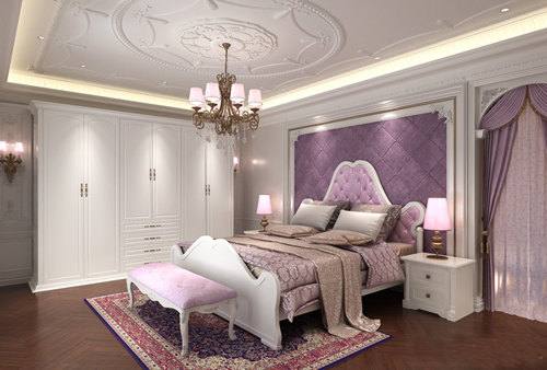 该白色系整体衣柜图片中,卧室空间由紫色和白色搭配而成,以两种色调组合出的空间更加优雅特别。纯白整体衣柜图片柜子造型方正简单,不需过多坠饰,易于保养清洁,也大方利落,营造出一个优雅大方的薰衣草乐园。