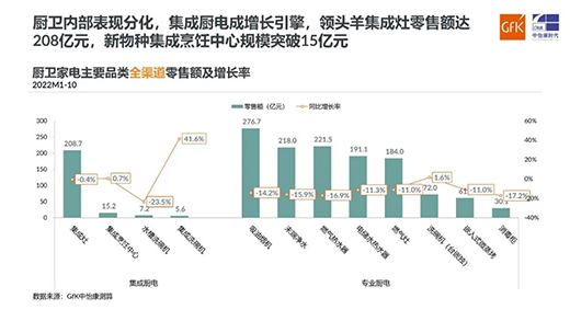 厨卫电器遭遇挑战,内部品类分化明显。发展时间较长、较为成熟的油烟机、燃气灶、热水器等专业厨电产品出现了零售额大幅同比下滑。2022年1~10月,油烟机零售额同比下滑14.2%,燃气灶下滑11.0%,燃气热水器下滑16.9%,降幅基本都大于行业平均水平。作为行业发展新引擎的集成厨电则在不断发展壮大,从目前数据看,包括集成灶、集成烹饪中心、水槽洗碗机、集成洗碗机等品类在内,集成厨电规模已经达到237亿元,在厨卫电器内部占比达到了15%。其中,集成洗碗机零售额同比涨幅达到41.6%,表现优异;集成灶零售额保持稳定,规模达209亿元,位列厨卫电器行业第四位,相信随着后期疫情的解封和管控政策变化,压抑的需求会再次释放,品类将迎来利好。
