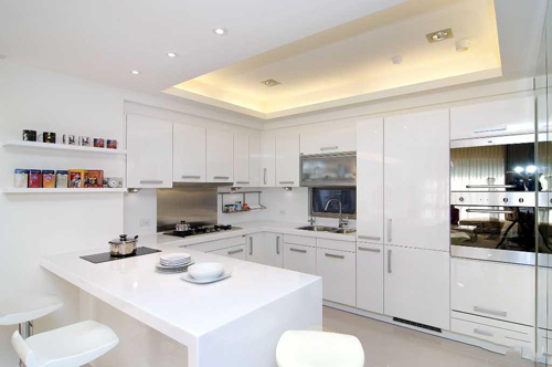 在该整体厨房设计图中,橱柜安置传承了西方文化底蕴,静静泛着影影绰绰的灯光,朦胧、浪漫之感油然而生。整个空间摒弃传统欧式橱柜的鲜亮色彩,选择淡雅素净的色调,营造出温馨典雅的烹饪环境。这个简欧风格的厨房,选择了白色为主色调,给人一种简洁明快的感觉。