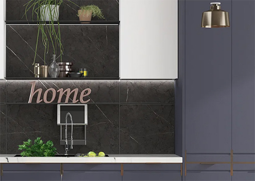 沉稳的深黑灰,搭配白色调的石纹饰面,再与充满张力的哑蓝相互碰撞,给人带来平静的同时,更增添了层次感。