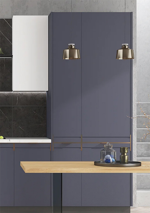 蓝色,作为大海的颜色,给人类的心灵带来平和与宁静。新品「洱海」橱柜在配色上对蓝色的运用可谓精彩至极。橱柜大面积地采用哑蓝调,返璞归真的纯色让人仿佛置身于暖熏和风,宁静融融的海边。