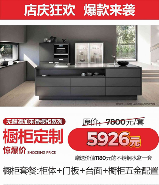 金平洋周年庆活动期间,无醛添加禾香橱柜系列橱柜定制,原价7800元/套,周年庆惊爆价5926元!并赠送价值1180元的不锈钢水盆一套!