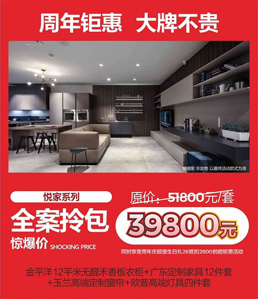金平洋周年庆活动期间,悦家系列全案拎包,原价51800元,周年庆抢购价39800元!同时,享受周年庆超值生日礼26抵扣2600的超钜惠活动!定制加成品12件加窗帘加灯饰,一站整配,拎包入住!