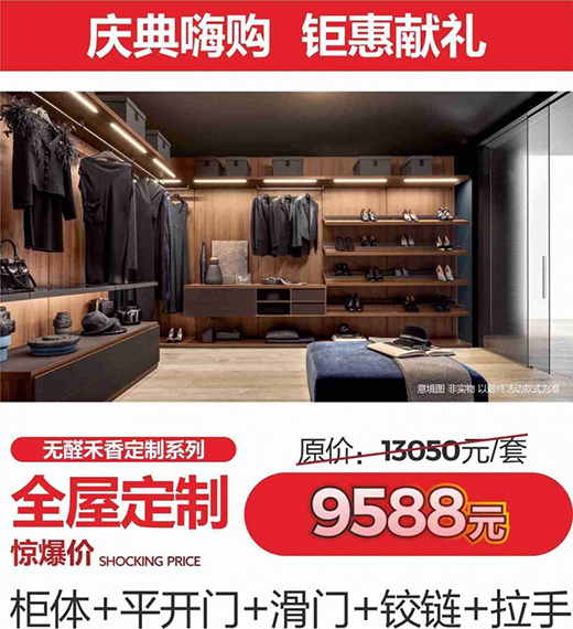 周年庆活动期间,无醛禾香板全屋定制,原价13050元,周年庆活动价9588元!搞定六大空间,无醛添加禾香板,守护家人健康!