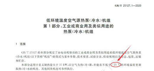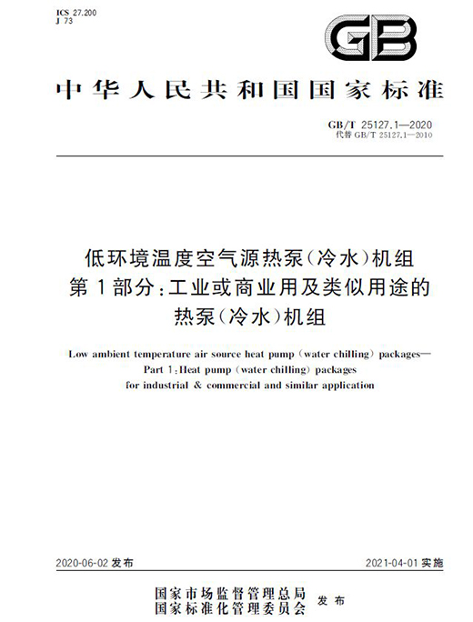 国家市场监督管理总局和国家标准化管理委员会于2020年6月2日发布最新低温空气源热泵(冷水)机组标准GB/T25127.1~.2-2020《低环境温度空气源热泵(冷水)机组》代替GB/T25127.1~.2-2010《低环境温度空气源热泵(冷水)机组》,新标准的实施时间为2021年4月1日,最新标准针对机组区分范围、机组型式、低温运行的温度、试验工况及允差等方面进行了更加严格的调整。