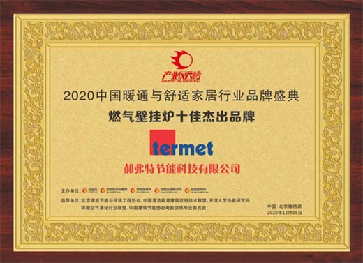 十二月五日,在来自全国暖通行业的各品牌方、代理商、经销商、工程商及各大媒体的的共同见证下,TERMET特梅特在于北京雁栖湖举行的年度中国暖通与舒适家居产业大会暨慧聪暖通行业品牌盛会上荣获“2020年度燃气壁挂炉十佳杰出品牌”称号。