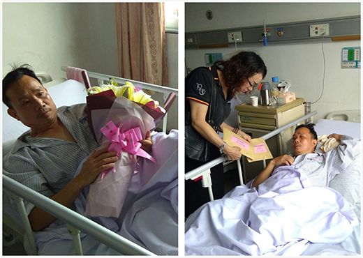 7月24日下午,广东菲斯顿总经办主任黄瑞英,与企业爱心基金部分管理委员一起,到中山市人民医院探望因病住院治疗的一线职工刘寿明,送上慰问品、2万元基金会慰问金及1万元的员工自发捐款。黄主任仔细询问病情,鼓励他要树立战胜病魔的信心,积极配合治疗,争取早日康复。领导们的探望慰问和亲切话语让刘寿明同志深刻感受到公司对他的关爱。他对公司的慰问和牵挂表示由衷的感谢。