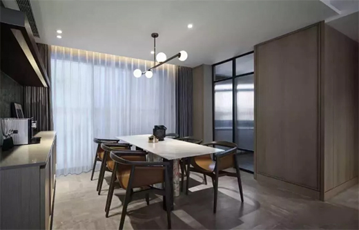 客厅开放式用餐空间舒张通透,宁静的墙体配色跳跃零星灯光以点与线的层次递进,点缀与家人围桌而食的美好记忆。现代都市干练简洁的浅奢气息,居家烟火气的温馨写意,在此空间徐徐弥漫。