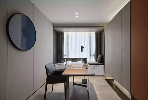 客厅、书房、餐厅采用一体化开放式布局,气氛利落贯通,视线一览无遗。融合的同时依然保持功能分区的独立,清晰流畅的线条层次营造了流动性的空间氛围。大尺寸阳台与落地窗的搭配无限放大景观界面,光景被最大化地保留于空间之中。纱帘掩映,简单纯粹之余又塑造朦胧开阔的画面。意式家具注重形体比例与物料搭配,为简洁细致的硬装氛围注入不同层次的触感。