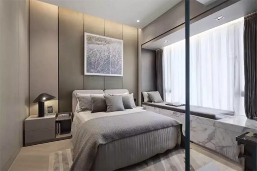背景墙柔软的肌理线条内嵌的灯带发出柔软微妙的灯光,为空间增添细腻灵动的情调。间接光源带来的温暖质地,为现代风格卧室注入了一种旧时光的随意慵懒。