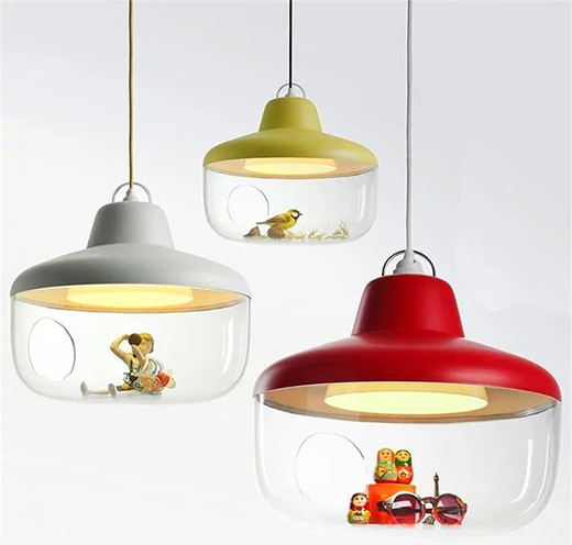 这是一款很超有爱的吊灯,整体是房屋的造型,透明灯罩,看起来像一间透明的房间。灯罩的侧边留有一个圆孔,可以把各种心爱的小物件放到这个“房间”里面去。因此它取名为“favourite things”。它可不是仅仅是一件装饰品,因为同样具备普通灯具的照明功能。而且完全不用担心它会发热,把你放在里面的心爱收藏品灼烧坏了。因为它的光源采用LED灯,日常使用的情况下,是不会过热、发烫的。它独特的造型,无论安装在书房、餐厅、儿童房都是不错的选择。