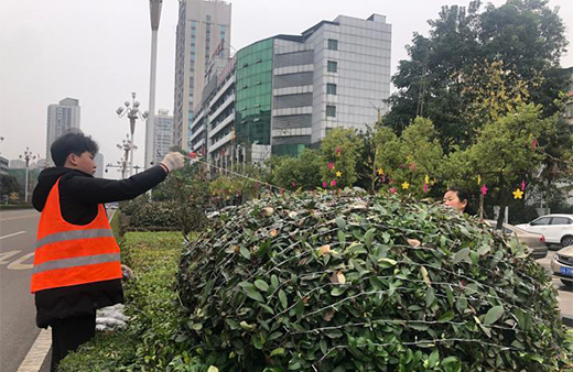 满天星灯串装扮道路两旁绿化带