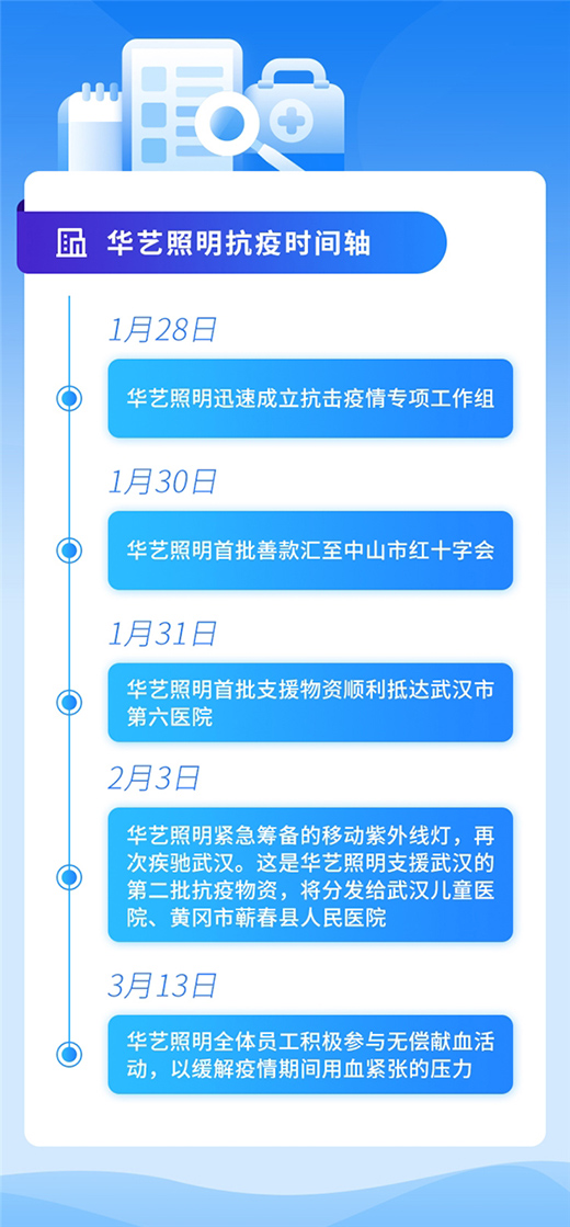 2020年,华艺照明在举国共同抗疫的伟大篇章中,为勇担社会责任做出积极表率:在完善的防疫体系下实现全面复工复产,并迅速联动集团公司各大板块募集照明设备、资金与物资,在防疫与生产的“双战线”上取得了显著成效,为广大制造企业树立起疫情防控与爱国战“疫”的标杆!
