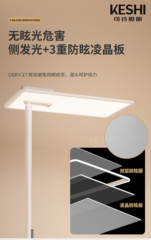这款产品不仅巧妙地采用了侧发光,且应用上3重防眩设计,包括双层防眩膜及凌晶防眩板,防眩效果经得起考验。经测试,UGR≤17,无眩光危害,本款护眼灯产品真正做到从源头呵护眼睛,有效避免使用者用眼疲劳。