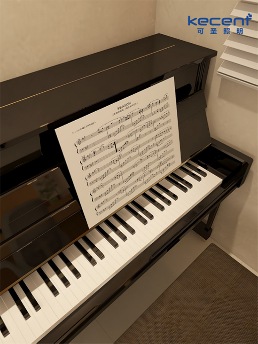 钢琴区采用三盏防眩射灯(7W 36° 4000K)做洗墙照明,光弧清晰的小山丘打在墙上,增添了一份灵动感,让人不禁想象着,那漂亮的小山丘就像是舞者的裙摆,它会随着美妙的音符跳动起来,跳出动人的圆舞曲。