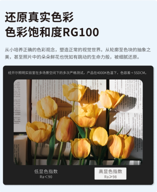 高显色是体现全光谱护眼灯的重要优势之一。Rf97色彩逼真度,Rg100色彩饱和,像博物馆般还原细腻灵动色彩,呵护孩子色彩敏感,提高肉眼辨色力。经开尔照明实验室在多场景空间下的多次严格测试,产品在4000K色温下,色容差<5SDCM。