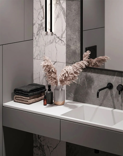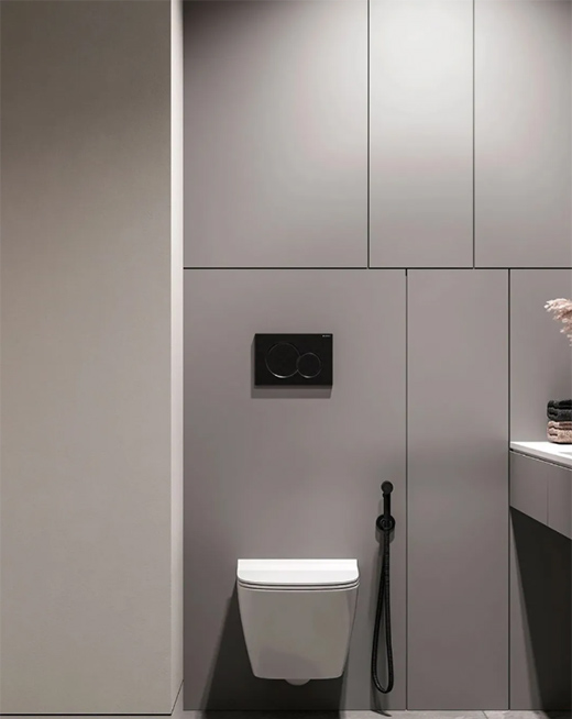 干区 | 智能座便器,轻松操作,洁净自如单台盆时尚简约,空出的台面放置沐浴时的换洗衣物,抽屉收纳浴室用品。同时利用超大浴室镜柜从视觉上增强了空间感。