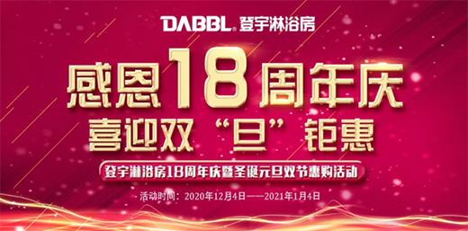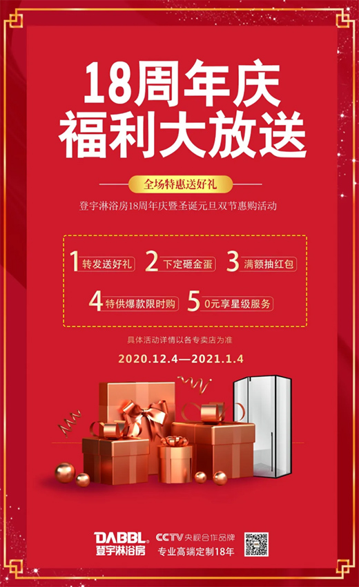 为回馈多年来新老客户的信任与支持,2020年12月4日-2021年1月4日,登宇淋浴房18周年庆暨圣诞元旦双节惠购活动盛大开启,为消费者带来高品质的消费盛宴。