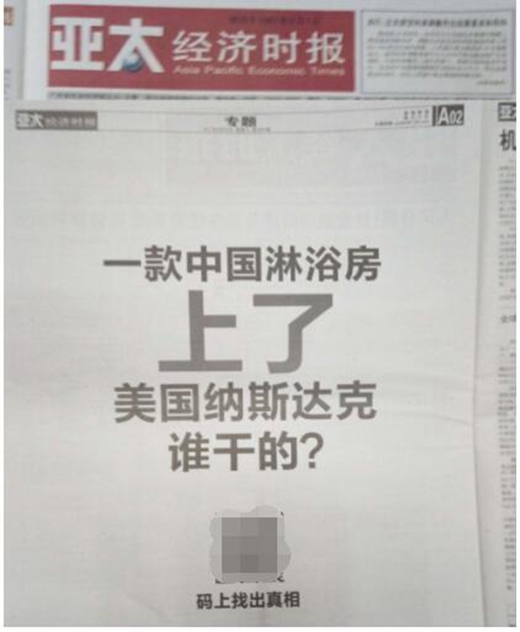日前,亚太经济时报全版专题:一款中国淋浴房上了美国纳斯达克!再配上一个二维码,简单醒目的报道,一时引发众议纷纷。