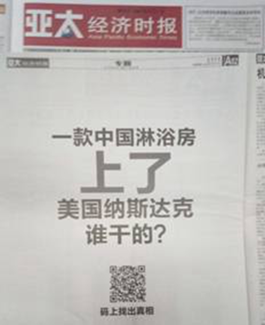 国庆将至,亚太经济时报专题全版悬念广告,引出淋浴房领导品牌玫瑰岛大招:10月10号将在美国纳斯达克全球发布新品。
