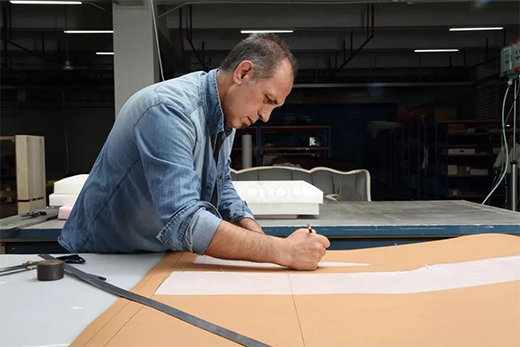 沙发框架开始制作之前,先由丰富经验的师傅1:1画好版式图样,还需要进行精细的计算,以确保各个构件之间的连接点紧密结合、互相支撑。