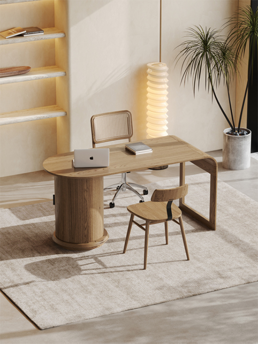 侘寂之美主张“不对称主义”,呈现一种不对称却包容的美。空间布局简约而随意,满足着最基本的功能需求,尽量保持布局中的“空”与极简,呈现侘寂风的随性之美。洛品有家此款不对称书桌,一边为具有储物功能的圆柱柜子,一边为支撑的长方体。曲线与直线的完美融合,整体呈现出一种分散却又统一的不确定感,使空间视觉上更加柔和纯粹。