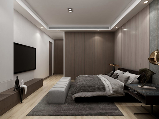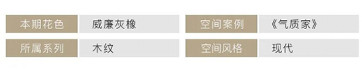 威廉灰橡-《气质家》空间里大量使用木材花色作为背景墙和护墙,主要花色为威廉灰橡,暖灰调的木材与大地色的色彩使整个空间富有高级感又让人舒适温暖,搭配少量石材作为点缀以达到空间的冷暖平衡。