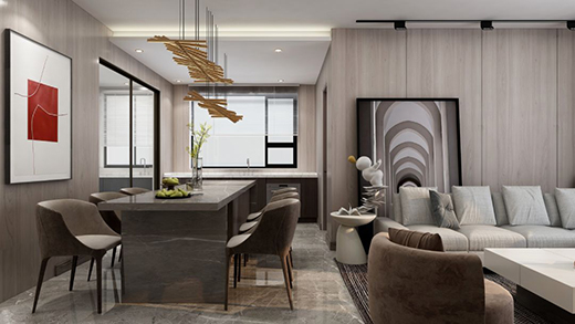 没有使用奢侈绚烂的饰品装饰,而是使用有艺术感的饰品及灯饰,点缀以少量金色金属质感,提升空间档次同时又低调内敛。