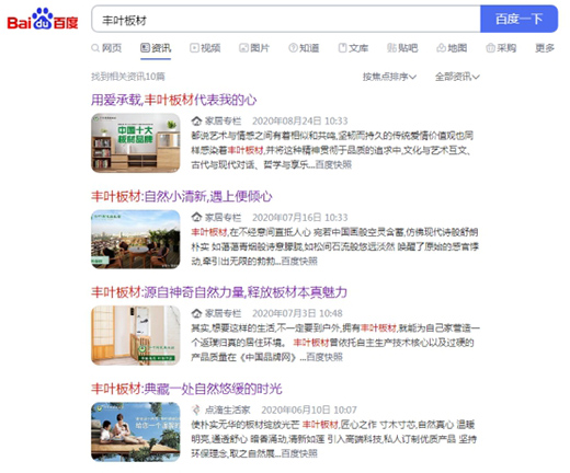 在浏览官网后,我们再看看资讯板块的搜索结果,进一步了解丰叶品牌在新品发布、经销商会议、客户案例、参展活动等方面的最新资讯,精准捕捉该品牌的多维度实力。据了解,丰叶板材已与《新浪家居》、《太平洋家居网》、《中华网》、《今日头条》、《搜狐网》等数百家行业媒体达成战略合作,将全年为网友更新品牌的实时资讯,让自身的产品革新及技术升级工作更公开化、透明化。