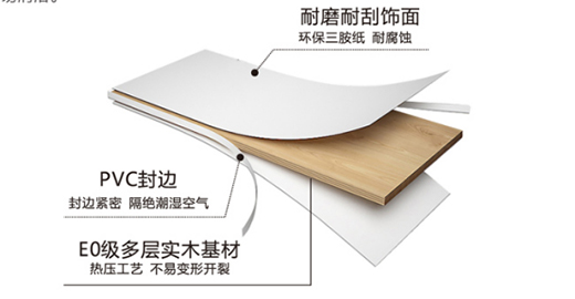 甄选全球有氧木材,A+++级芯材,采用新型环保胶粘剂。防水、防潮、防蛀,板材表面是无缝三聚氰胺纸贴面,上面还附有防潮隔阻膜。