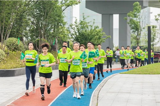 早上8:00,随着“砰”的一声,董事长夫人徐君兰女士扣动发令枪,马拉松比赛准时在良渚门户公园开跑。董事长陆铜华奋勇当先,带着大部队冲向色彩鲜艳的健康跑道。