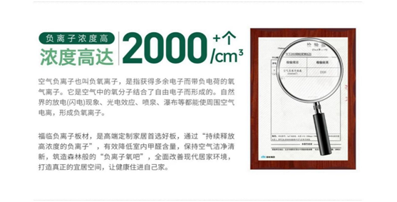福临负离子生态板不仅具有接近无醛级的优势,还能长效释放对人体有益的负离子,降低室内甲醛浓度、中和空气中的一些有害物质,以此实现居家空间净化效果。