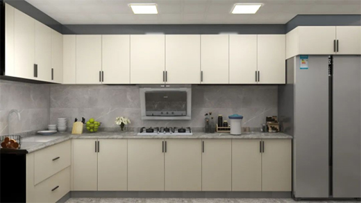无论户型大小,厨房定是居家生活中不可或缺的空间。本案的厨房柜门采用的是莫兰迪H-01花色,颜值在线,让人看看就觉得很温馨,平开门与抽屉式的组合柜,增强了厨房的实用性。