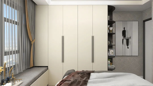 飘窗兼顾收纳与休闲的双重功能,飘窗上的收纳柜使得整体空间更整洁不零乱,而莫兰迪花色的柜门板,色泽饱和不张扬,就像冬日的阳光洒满房间般温暖。