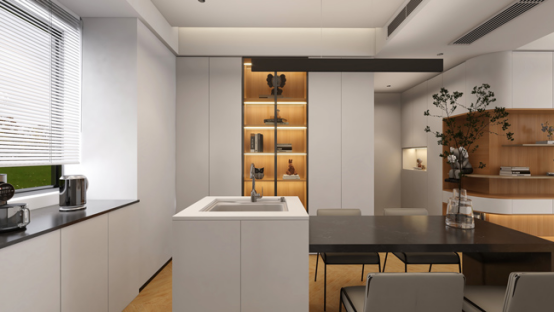 餐厅与厨房,通过玻璃移门分隔两边