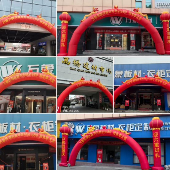 万象板材、万象天冠高端衣柜定制,启动终端门店全方位同步焕新计划。以“视觉吸睛+体验沉浸”为核心设计理念,打造层层递进的购买场景:从空间布局到细节装饰,均深度融合活动主题;拱门营造的节日氛围渗透门店每个角落,让客户在沉浸式体验中,直观感受万象品牌的温度与质感。