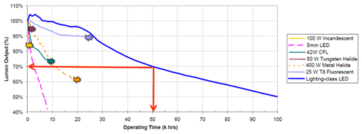 所有的传统光源的性能都会随着时间的推移而退化(输出流明值降低),即使是LED也是如此。传统光源的失效,往往是因为灯丝工作一段时间后开路而导致不能再使用;而LED在驱动设计合理的条件下(恒流驱动),退化非常缓慢,使用寿命远远大于传统光源。