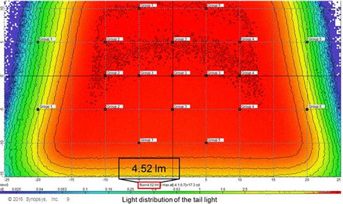 真实光源发射出的平行光击中抛物面反射镜,通过抛物面反射镜生成虚拟光源,耦合反射镜以虚拟光源为物像产生镜像,从而创建出所需的光分布。本次实验中所用的真实光源为5流明的LED灯,而从测试仪器中可检测到4.52流明,也就是说,超过90%的发光通量被有效利用,这对于尾灯来说是很有必要的一个特点。