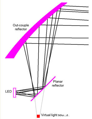 大多数汽车照明系统使用非成像光学系统,包括光学元件和一个真实光源。在进行照明系统设计时,使用虚拟光源需要用到额外的光学元件来构建一个虚拟光源,这可能会使设计过程更为复杂。但是这种方法打破了传统汽车照明设计的限制,为汽车前照明和照明系统提供新的方法来构建光照模式,丰富了造型的自由度。本文将简单介绍虚拟光源的成像原理,并通过两个车灯的例子来具体描述虚拟光源为汽车照明设计带来的优势。